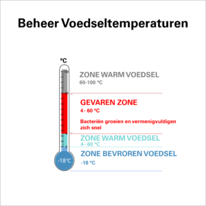 Binnen een bereik van 20-45°C (68-133°F) kunnen de meest voorkomende voedselgerelateerde bacteriën sneller groeien en zich vermenigvuldigen. Dit temperatuurbereik wordt de gevarenzone genoemd. De snelste groei ligt rond de temperatuur van het menselijk lichaam, rond de 37°C.